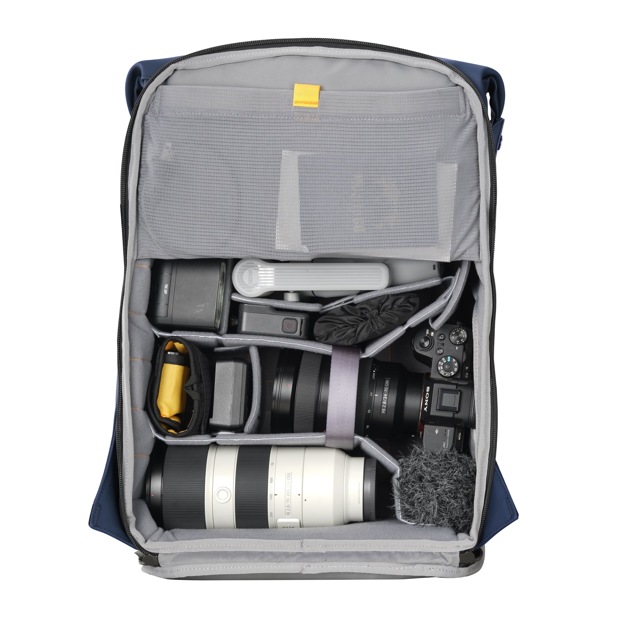 È dotata di uno scomparto superiore in stile daypack, di un rapido accesso laterale all'attrezzatura e di un'apertura posteriore completa per la massima versatilità e sicurezza durante i servizi fotografici.